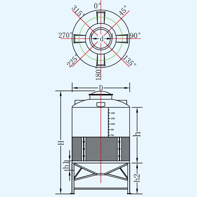 | 名稱(chēng) | 型號(hào) | 容量L | 桶體直徑D | 人孔d | 含腳總高度H | 垂高h(yuǎn) | 錐高h(yuǎn)1 | 腳高h(yuǎn)2 | 平均厚度mm |