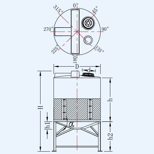 | 名稱 | 型號 | 容量L | 桶體直徑D | 人孔直徑d | 含腳總高H | 垂高h | 錐高h2 | 腳高h1 | 平均厚度mm |