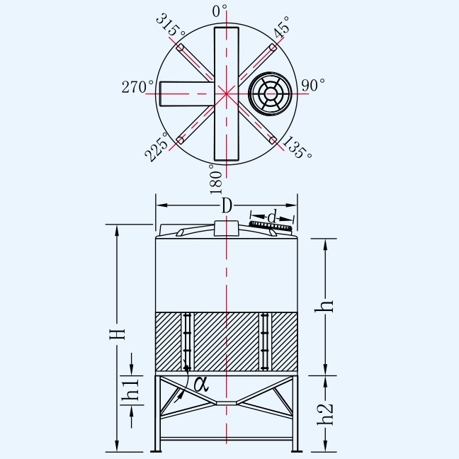 | 名稱 | 型號(hào) | 容量L | 桶體直徑D | 人孔直徑d | 含腳總高H | 垂高h(yuǎn) | 錐高h(yuǎn)2 | 腳高h(yuǎn)1 | 平均厚度mm |