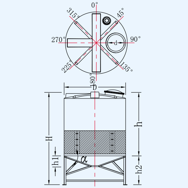 | 名稱 | 型號 | 容量L | 桶體直徑D | 人孔直徑d | 含腳總高H | 垂高h(yuǎn) | 錐高h(yuǎn)2 | 腳高h(yuǎn)1 | 平均厚度mm |