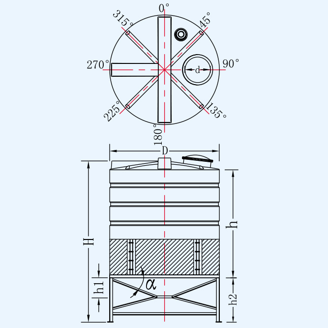 | 名稱 | 型號 | 容量L | 桶體直徑D | 人孔直徑d | 含腳總高H | 垂高h(yuǎn) | 錐高h(yuǎn)2 | 腳高h(yuǎn)1 | 平均厚度mm |