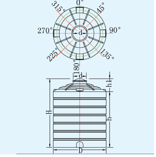 3、PE塑料水箱上面有四個向上的平面,下面有四個成十字形分布的側面平面,可從四個不同的方向安裝進水口、出水口、排液口和其他管道。