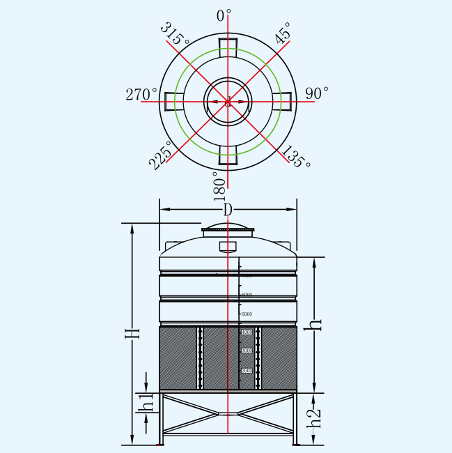 | 名稱 | 型號 | 容量L | 桶體直徑D | 人孔直徑d | 含腳總高度H | 垂高h | 錐高h1 | 腳高h2 | 平均厚度mm |