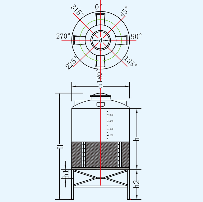 | 名稱 | 型號 | 容量L | 桶體直徑D | 人孔d | 含腳總高度H | 垂高h(yuǎn) | 錐高h(yuǎn)1 | 腳高h(yuǎn)2 | 平均厚度mm |