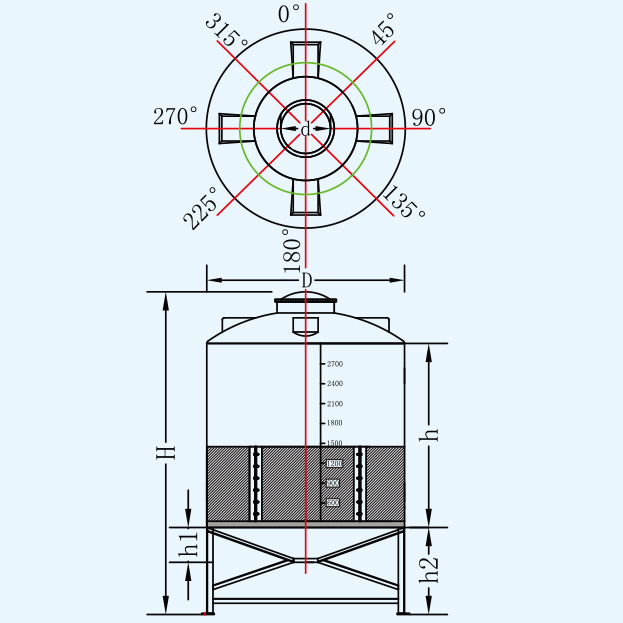 | 名稱 | 型號(hào) | 容量L | 桶體直徑D | 人孔直徑d | 含腳總高度H | 垂高h(yuǎn) | 錐高h(yuǎn)1 | 腳高h(yuǎn)2 | 平均厚度mm |