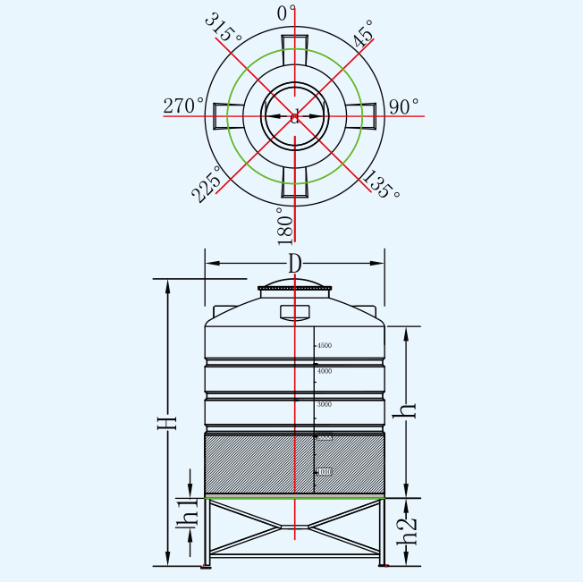 | 名稱 | 型號 | 容量L | 桶體直徑D | 人孔直徑d | 總腳高度H | 垂高h(yuǎn) | 腳高h(yuǎn)1 | 錐高h(yuǎn)2 | 平均厚度mm |