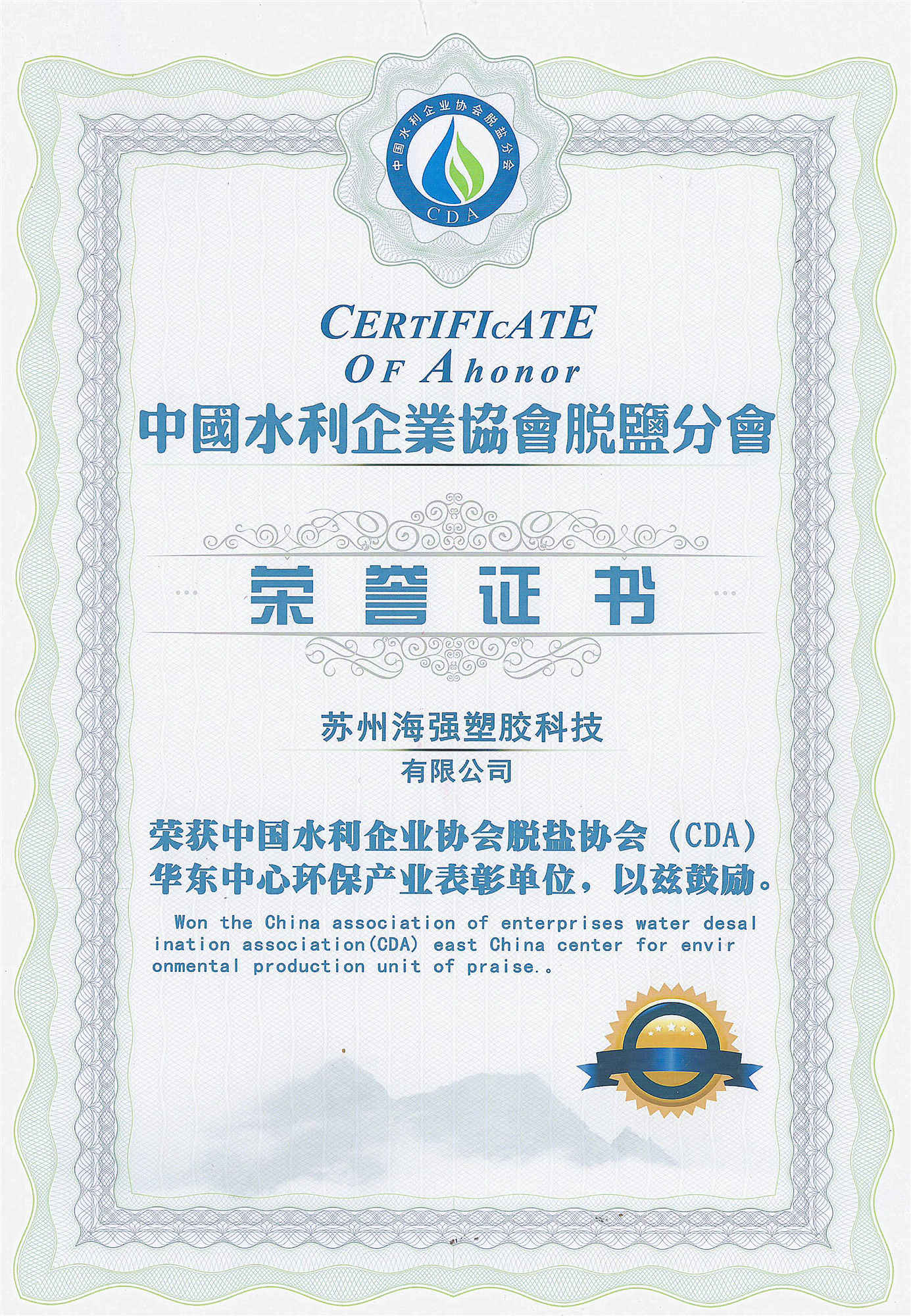 蘇州海強塑膠科技有限公司-中國水利企業(yè)協(xié)會證書