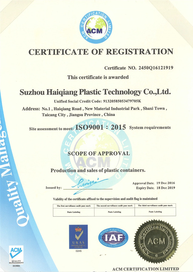 蘇州海強塑膠科技有限公司-ISO9001證書